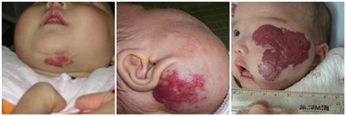 1、瘤体外观特征(葡萄酒斑状或杨梅状等)。