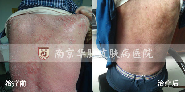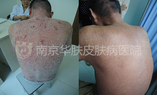刚开始全身有很多红色丘疹,后又丘疹融合成片,形成呈红斑,上面有厚厚的鳞屑,经常脱屑。 【详细】