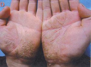 3、慢性湿疹:多因急性、亚急性湿疹反复发作演变而成,性格亦可开始即呈现慢性炎症。患处皮肤浸润增厚,变成暗红色及色素沉着。持久不愈时,皮损纹变粗大,表现干燥而易发生皲裂。